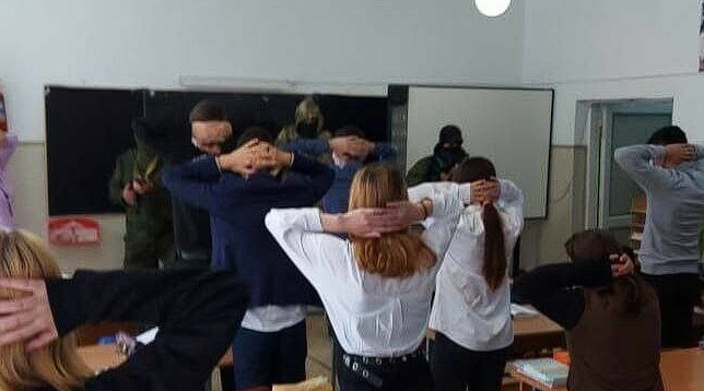 Роль «терористів» у масках, які з автоматами увірвалися до класу під час уроку, виконали охоронець, учитель ОБЖ та учень 9 класу. Проте після публікації ролика до школи прийшли вже із прокуратури.