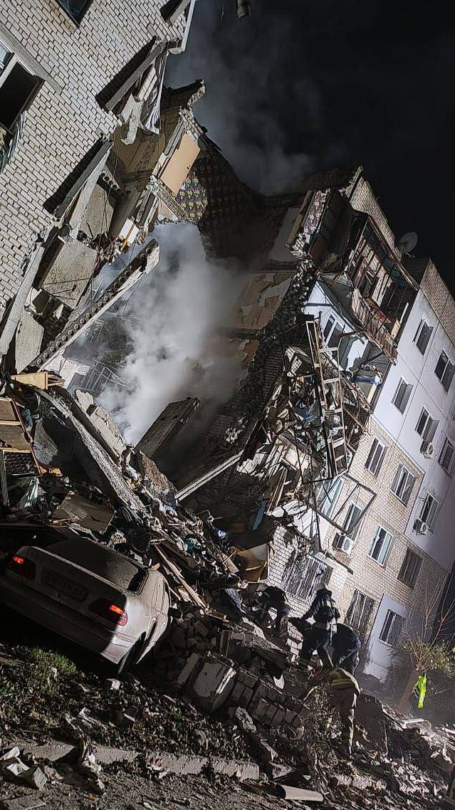 - У Миколаєві потрапили до житлового будинку, двоє людей загинули, ще двоє поранено. Сьогодні вночі руська обстріляла місто із ЗРК С-300. В результаті є приліт у п'ятиповерхівку. Зруйновано всі п'ять поверхів, ведутьсяя пошуково-рятувальні роботи.