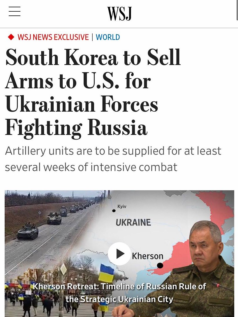 - США закуплять у Південної Кореї артилерійські боєприпаси для України, яких має вистачити на кілька тижнів інтенсивних боїв. -for-ukraine-11668116294) The Wall Street Journal. Південна Корея вперше продасть артилерійські снаряди, призначені для українських сил, у рамках конфіденційної угоди щодо постачання зброї між Сеулом та Вашингтоном.