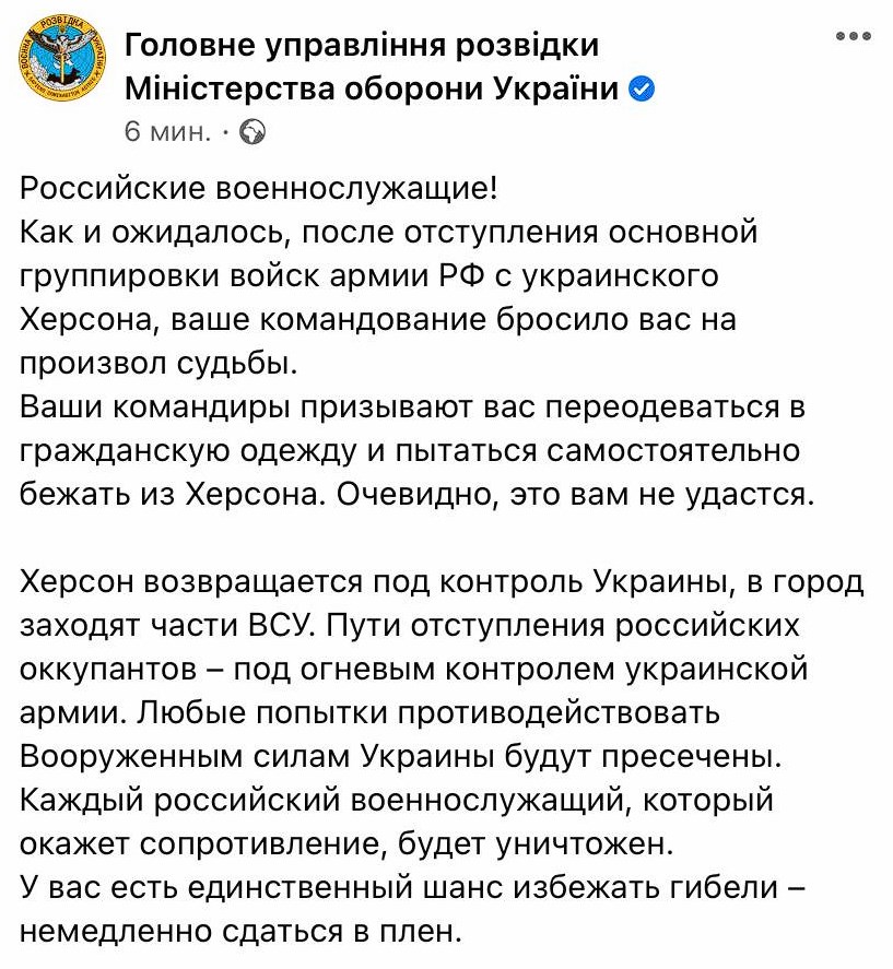 - Офіційно: Херсон повернувся під контроль України, - ГУР. ЗСУ заходять до міста. Шляхи відступу російських окупантів – під вогневим контролем української армії Тих русаків, хто не встиг звалити, закликають здаватися в полон.