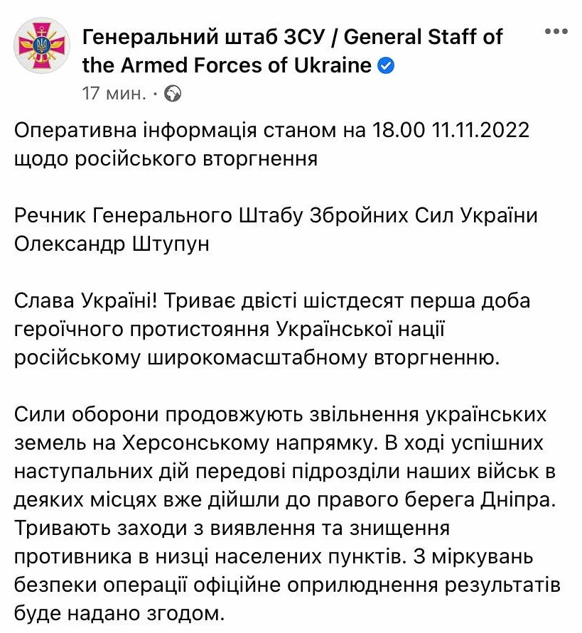 - ЗСУ в деяких місцях уже дійшли до правого берега Дніпра, продовжується знищення противника, повідомляє Генштаб.