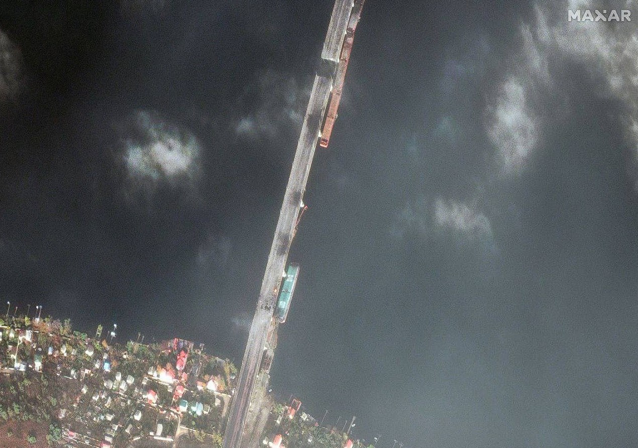 - Антонівський міст із супутника. На знімку помітні сильні пошкодження конструкції.