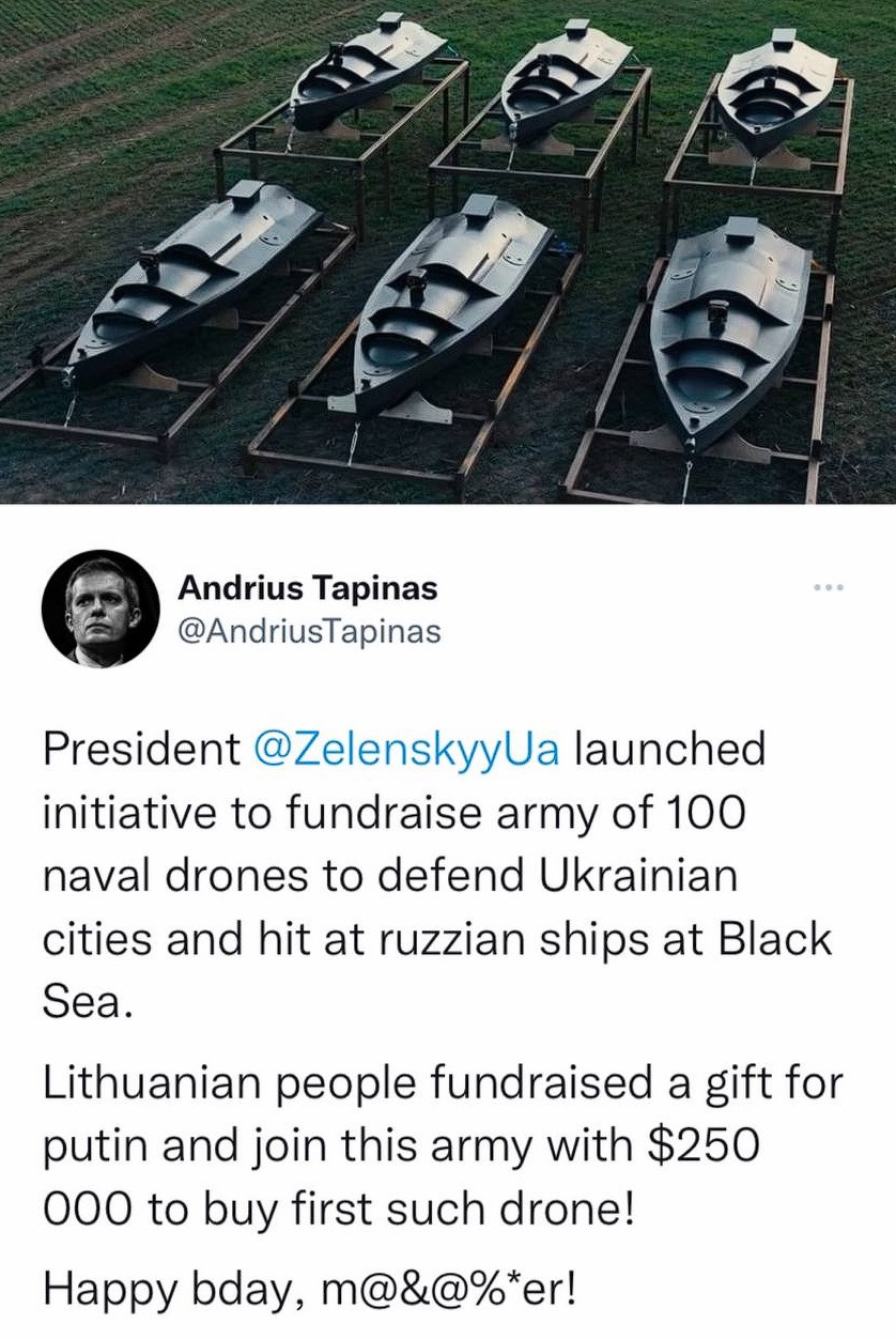 - «Подарунок для путіну»: у Литві зібрали $250 тис. на морський дрон для України. Про це оголосив литовський журналіст Андрюс Тапінас.