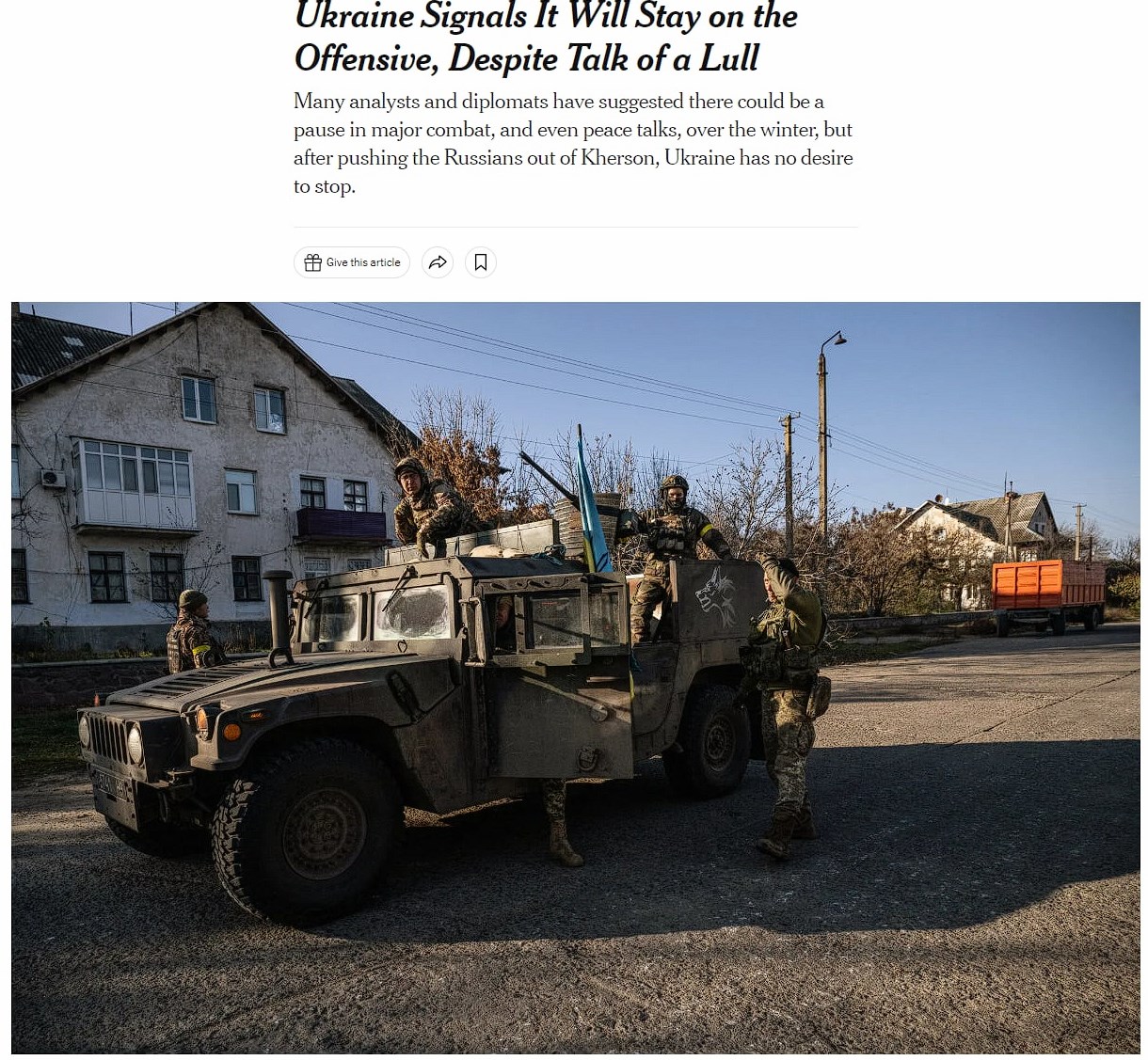 - Україна не демонструє потягу до перемир'я і має намір продовжувати контрнаступ, пише The New York Times.
