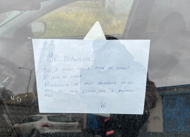 «Шановна поліція! Так, я знаю, що в мене немає коліс! Я сама їх зняла. Будь ласка, не треба приходити через це до мене додому, як минулого року»