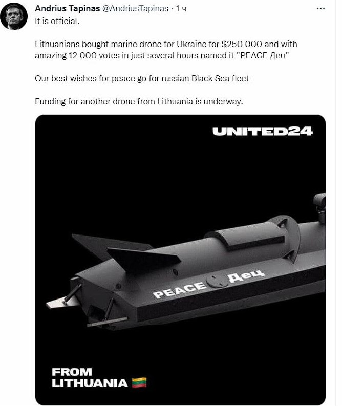 "З найкращими побажаннями світу для російського Чорноморського флоту. Фінансування ще одного безпілотника з Литви продовжується", - повідомив журналіст Андрюс Тапінас.
