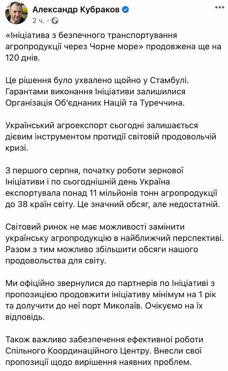 - «Зернову угоду» продовжили на 120 днів. Про це повідомив міністр інфраструктури Олександр Кубраков. Гарантами виконання ініціативи виступають ООН та Туреччина.