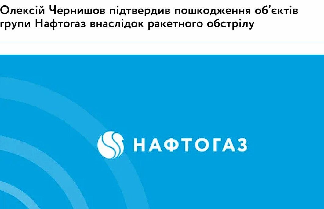 - Росія сьогодні здійснила масований обстріл газовидобувної інфраструктури України: кілька об'єктів зруйновано, ще кілька отримали пошкодження різного ступеня, — "Нафтогаз".