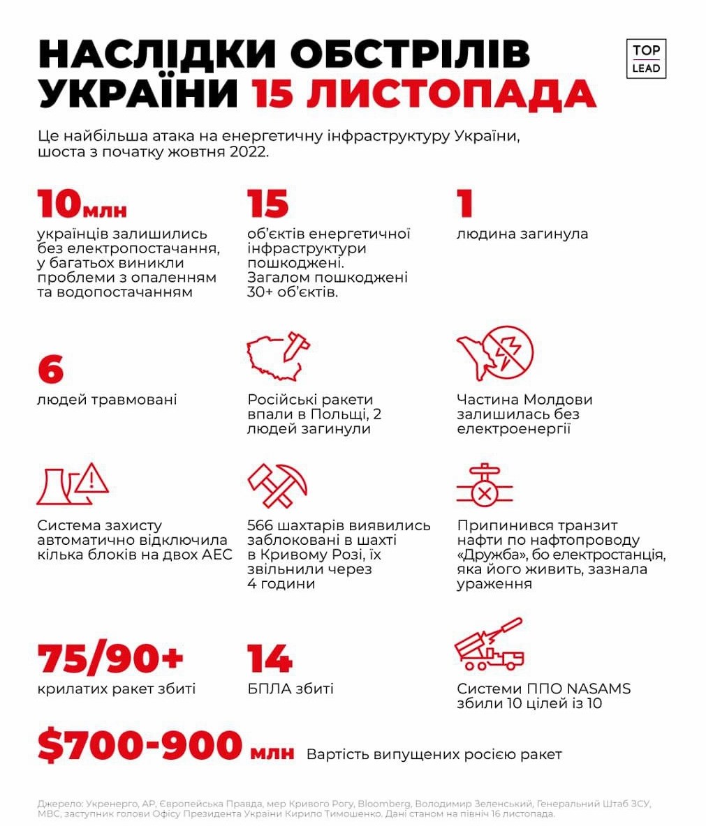 - Майже 1 мільярд доларів впав на нашу землю: коротко про наслідки наймасштабнішої атаки на енергетичну інфраструктуру 15 листопада.