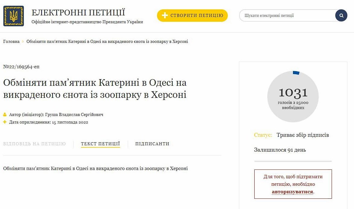 - Тут з'явилася петиція (https://petition.president.gov.ua/petition/169564) з пропозицією обміняти викраденого єнота на пам'ятник Катерині II.