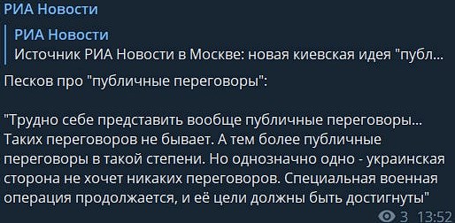 - "Київ однозначно не хоче жодних переговорів, мети СВО мають бути досягнуті" — писків.