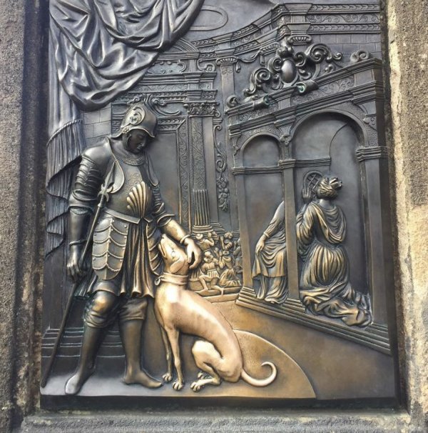 Меморіальна дошка під статую в Празі. Усі труть собаку на удачу