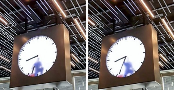 Годинник в аеропорту Амстердама. Усередині «людина» стирає та малює стрілки