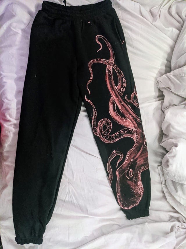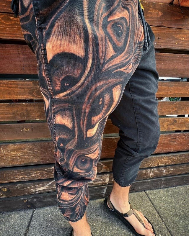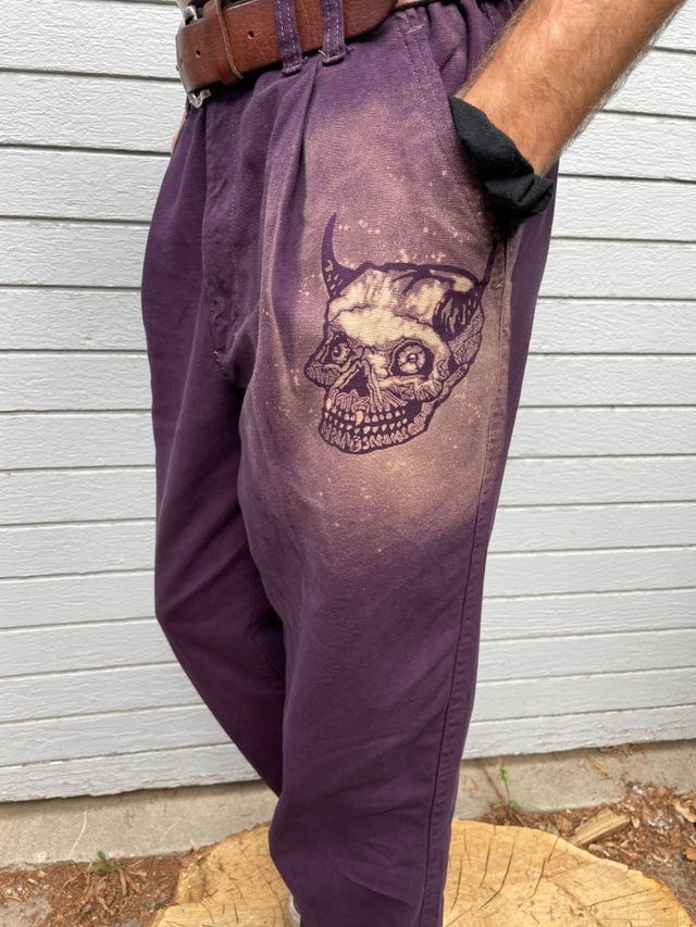 Намальований від руки і подекуди вибілений череп на фіолетових джинсах.