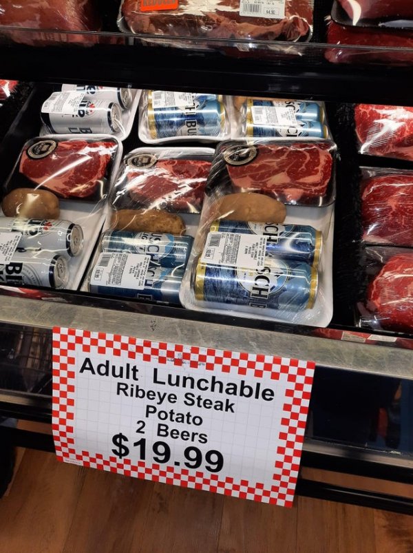 Холостяцький набір: стейк, картопля та дві банки пива.