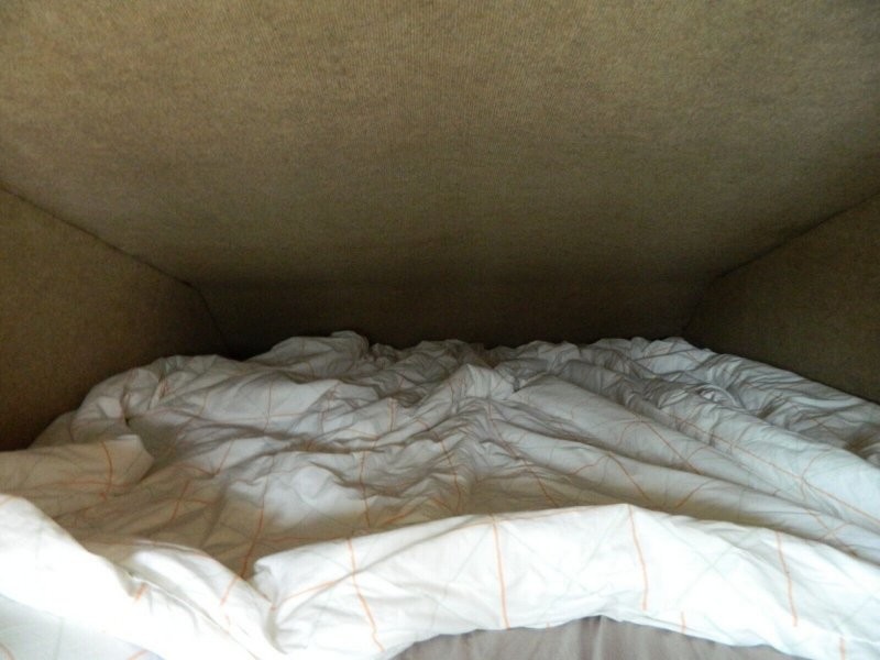Усередині знайшлося місце під велике ліжко (під дахом), кухонку з раковиною та плитою, а також численні ніші та скриньки для зберігання речей.