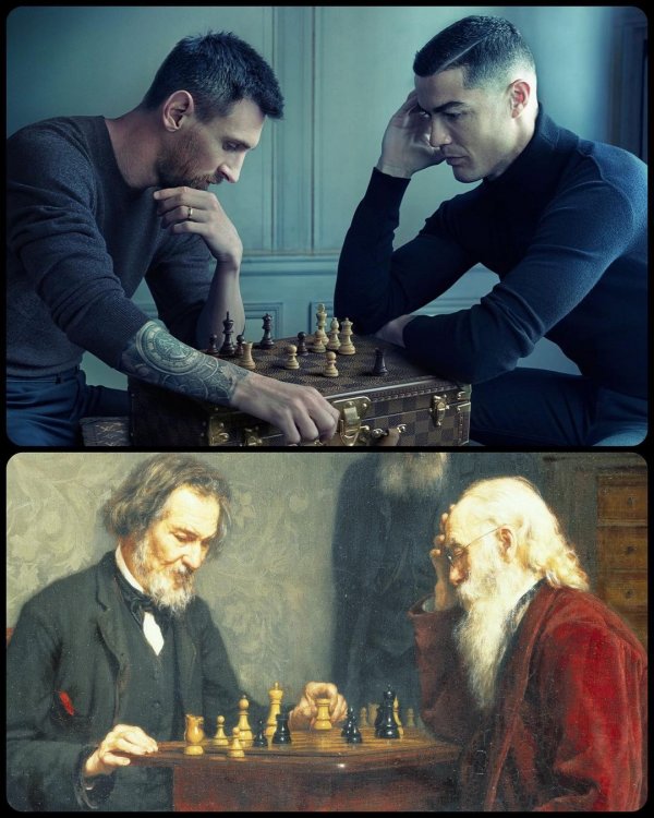 "Ветерани", Річард Крейфельдс, 1886 - з цією картиною автор робіт порівняв гру у шахи двох відомих футболістів, Роналду та Мессі. Нашумілий знімок футболістів для рекламної кампанії Louis Vuitton був зроблений фотографом Енні Лейбовіц та отримав назву «Перемога — це стан розуму».
