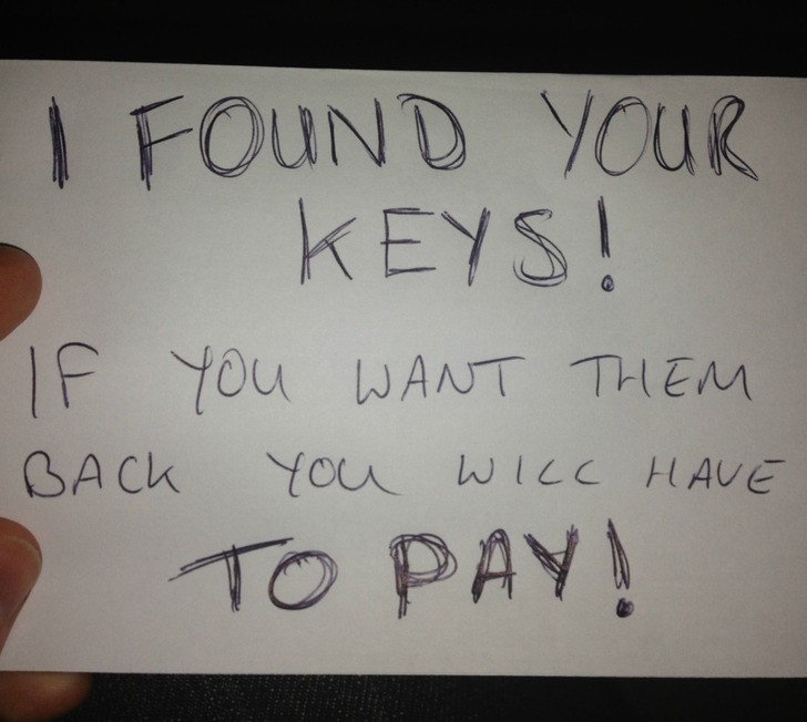 14. "Закрив машину і, мабуть, упустив ключі. Коли повернувся і побачив це: «Я знайшов твої ключі! Якщо хочеш їх одержати, доведеться заплатити!»