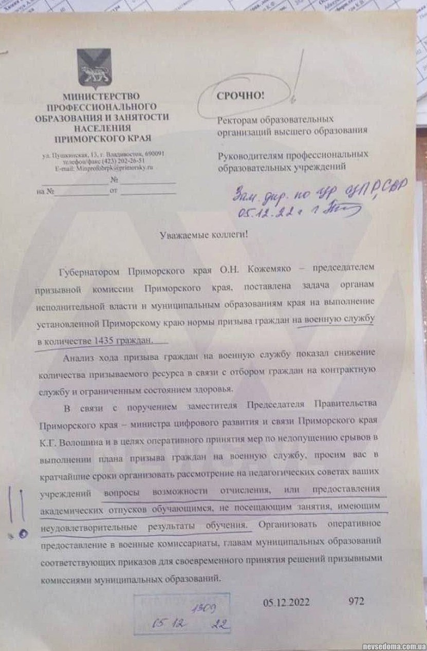У Приморському краї вирішили відправляти на війну учнів в університетах та інших середніх та вищих навчальних закладах. Насамперед, закликатимуть тих, хто погано вчиться і прогулює пари.
