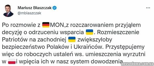 - Сумна картина. Німеччина не дозволила Польщі передати Україні системи ППО Patriot, — міністр оборони країни Маріуш Блащак.