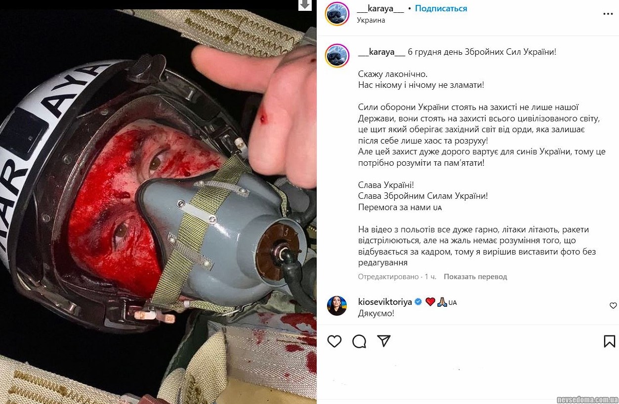 - Український льотчик Karaya після того, як йому довелося катапультуватись. Того дня він збив 5 іранських дронів-камікадзе, але після нього літак почав падати через технічні неполадки.