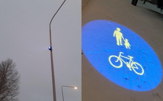 Світильник, прикріплений до ліхтарного стовпа, проектує зображення на землю, щоб показати, де знаходиться тротуар у випадку снігопаду