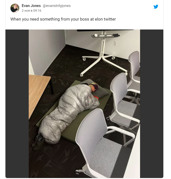 А цей знімок продакт-менеджера Твіттера Евана Джонса, на якому дівчина спить в офісі прямо біля стільців, з'явився на початку листопада.