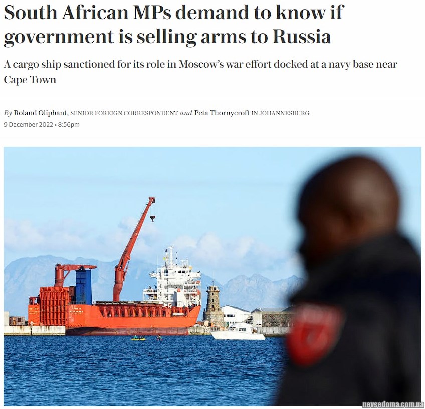 - Південна Африка продає зброї? Південноафриканські депутати вимагали дізнатися, чи продає уряд зброю Росії після того, як вантажне судно, санкціоноване за його роль у військових діях Москви, пришвартувалося на військово-морській базі неподалік Кейптауна і щось завантажувало.