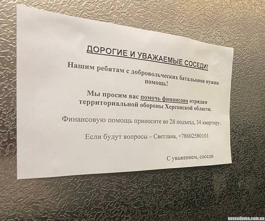 Все вірно, "рятівники", які увірвалися на нашу землю розраховують на фінансову підтримку місцевих, не полінувалися навіть роздрукувати оголошення. Охочих, звичайно, не знайшлося