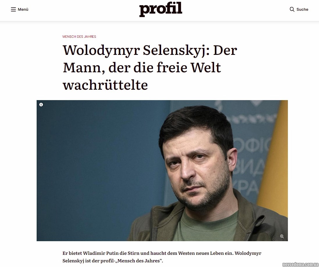 - Володимира Зеленського визнано Людиною року за версією австрійського видання Profil. Про обрання Зеленського Людиною року йдеться у статті під назвою "Володимир Зеленський: Людина, яка сколихнула вільний світ".