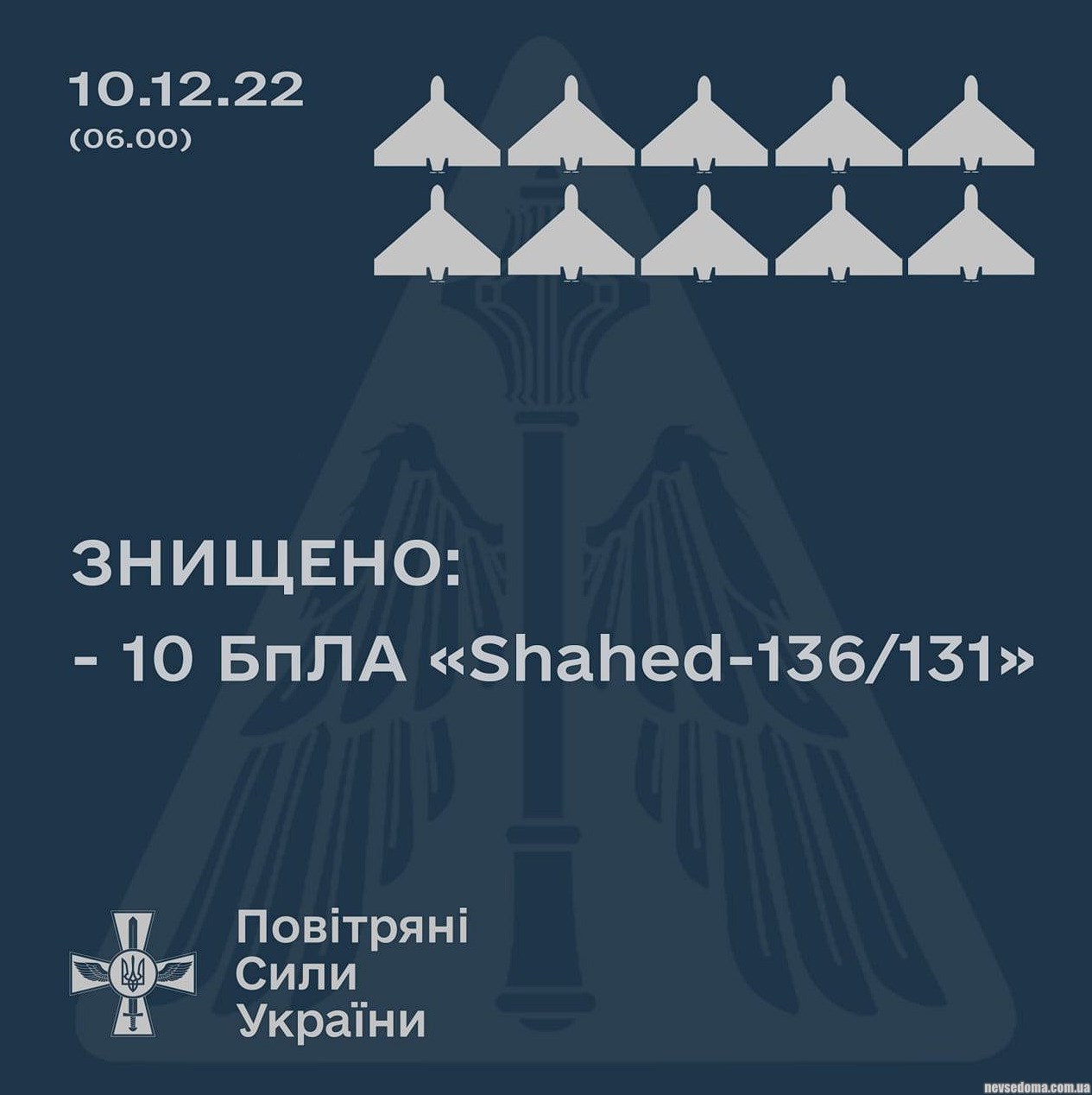 - Вночі збито над Україною 10 із 15 дронів-камікадзе, – Повітряні сили.