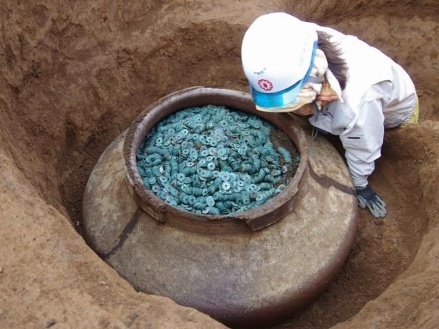 Імовірно, цей скарб був захований у XV столітті. Його виявили на території резиденції самураїв на північ від Токіо.