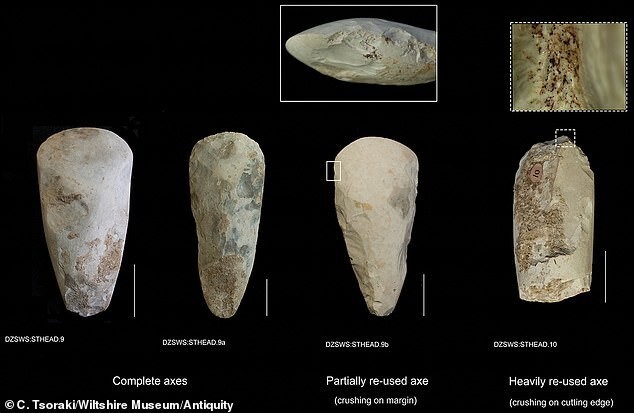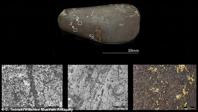 Дослідники провели аналіз мікрозносу, використовуючи потужні мікроскопи. для огляду слідів на поверхні інструментів, щоб краще зрозуміти, як вони були виготовлені та використовувалися. При цьому було виявлено, що ще чотири артефакти мають сліди золота, яке було підтверджено як доісторичне та мало домішки, що відповідають золотим виробам бронзового віку, знайденим у різних місцях Великобританії.