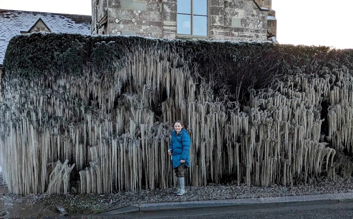 Прорив водопроводу перетворив приміську вулицю у Глостерширі на незвичайний ліс із бурульок після того, як Британія постраждала від мінусових температур.