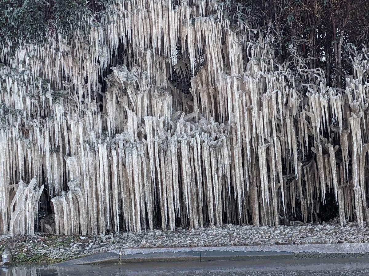Ліс із бурульок був створений автомобілями, що випадково проїжджали, які виплеснули воду з водопровідної магістралі, що прорвалася на жива огорожа біля узбіччя дороги.