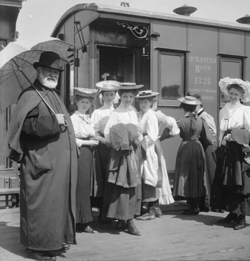 Гімназистки з поїздом, що супроводжує біля вагона. 1900-ті роки