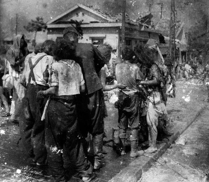Жителі Хіросіми, що вижили і вражені, збираються на вулиці через десять хвилин після атомного вибуху, 1945 рік