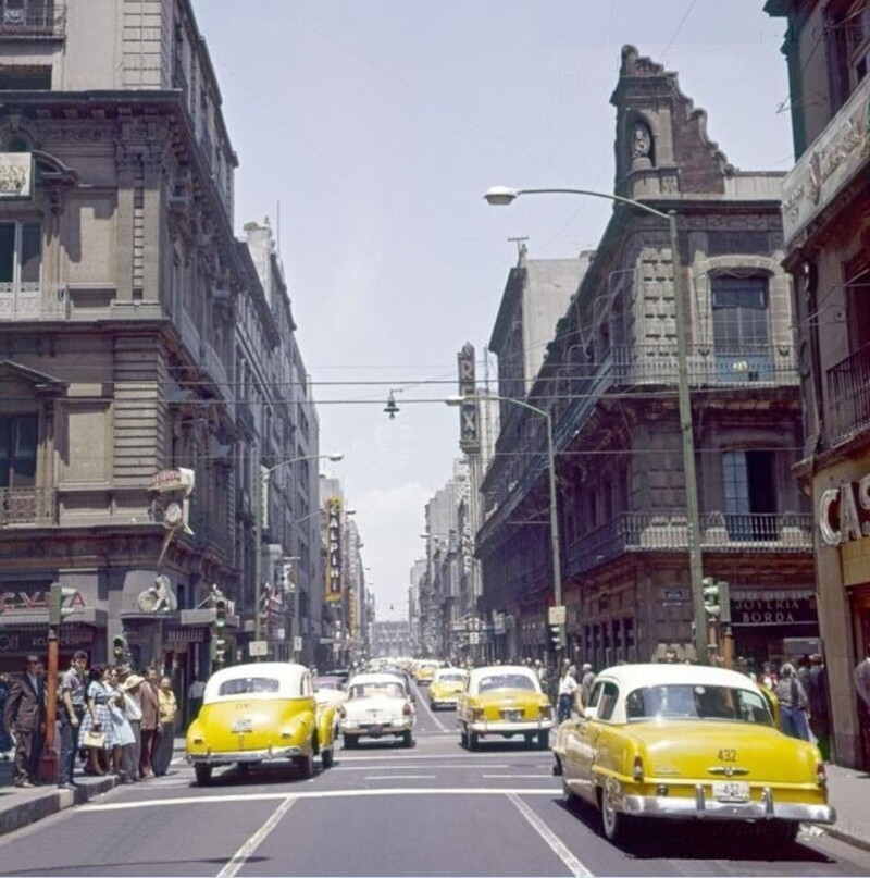Мехіко 1961 року демонструє несподівану схожість із Нью-Йорк за великою кількістю таксі в структурі вуличного трафіку, фотограф Frank Baake