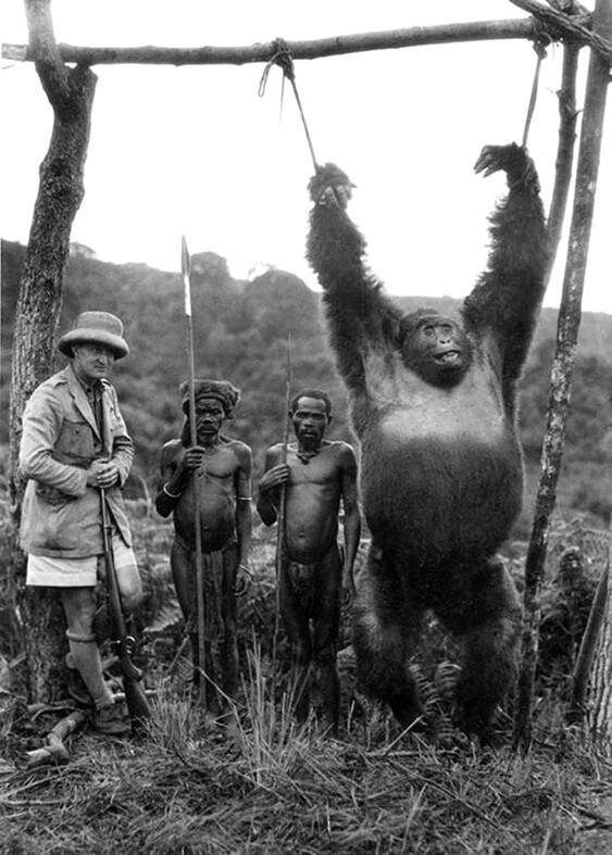 Італійський мандрівник Аттіліо Гатті з двома найнятими пігмеями та спійманою ними горилою у Бельгійському Конго, 1930 рік