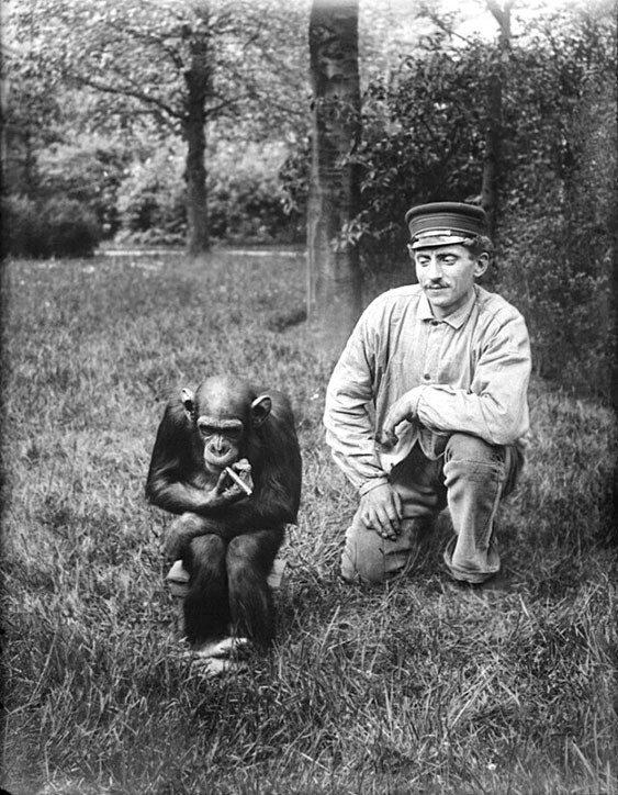 Шимпанзе зі доглядачем, Амстердам приблизно 1900 рік. Фотограф Пол Луї Стінхейзен