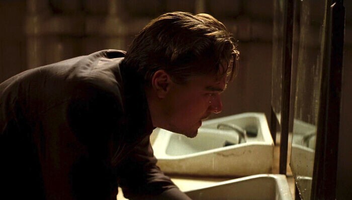 Герой вмивається холодною водою і загадково дивиться в дзеркало у вбиральні - індикатор того, що він чимось засмучений