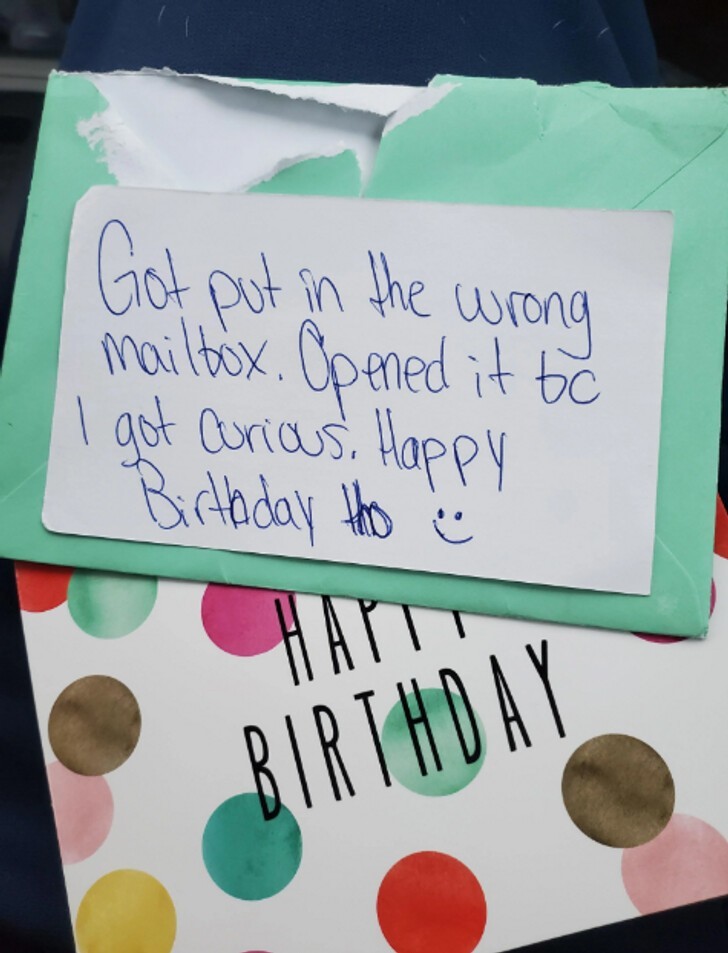 "Лист поклали помилково в мій ящик. Я його відкрив, тому що мені стало цікаво. З днем народження!"