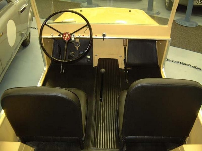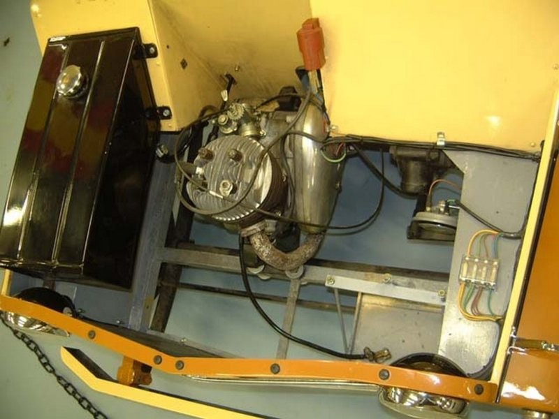 Під капотом виявляється багато вільного місця. Втім, праворуч можна помітити бензобак, а приблизно по центру розташований силовий агрегат, що є мотоциклетним двотактним 8-сильним мотором. об'ємом 200см3 та триступінчасту коробку передач, теж від мотоцикла.