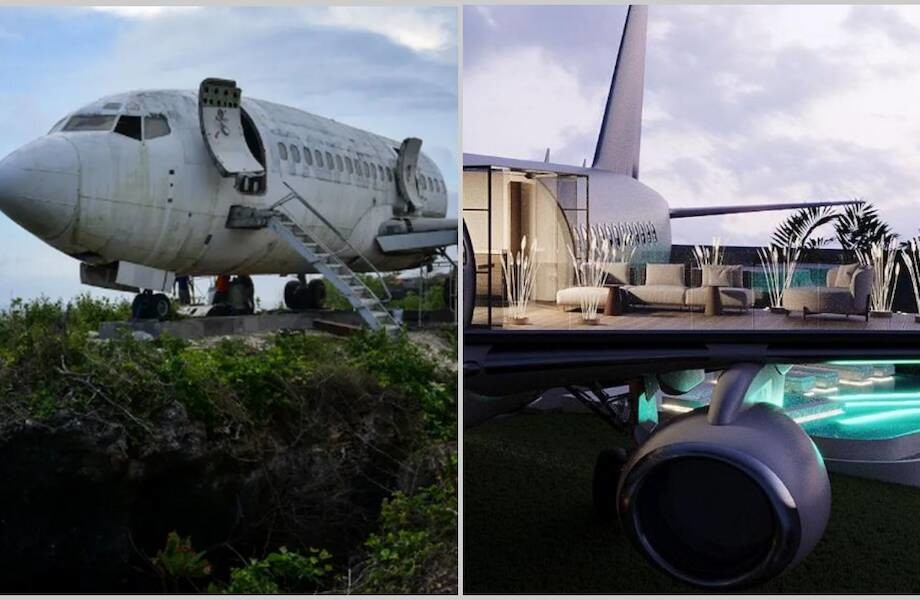 Іноді такі літаки стають не лише будинками, а й розкішні готелі. Один із таких готелів нещодавно з'явився на Балі. Старий літак навесні має прийняти своїх перших гостей, а ми пропонуємо вам дізнатися, як вдалося з гори металобрухту зробити шикарну віллу.