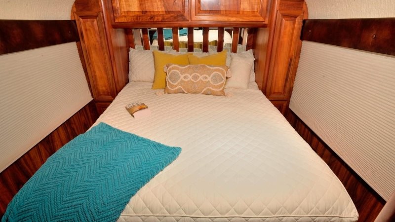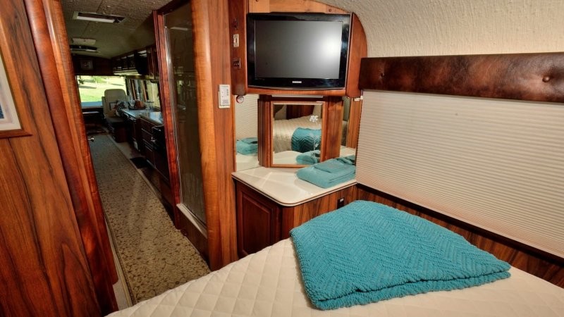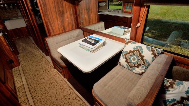 Майже всі меблі всередині виготовлені з дерева акації коа. Зробити поїздки та проживання в автобудинку комфортними покликані вбудований пилосос, два телевізори, кондиціонер та преміальна аудіосистема.