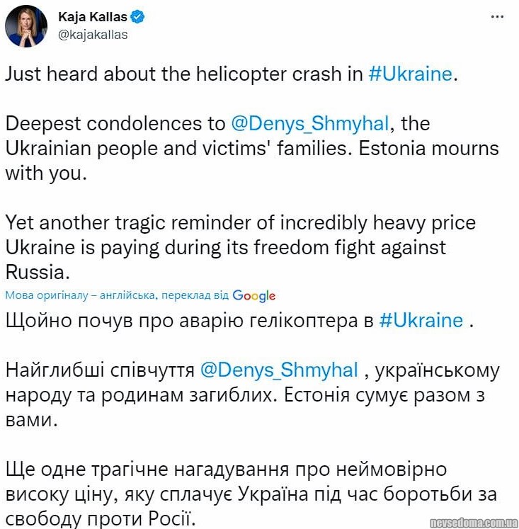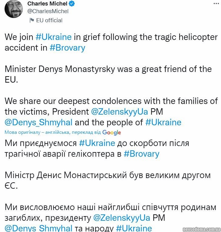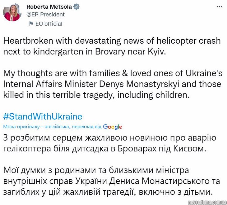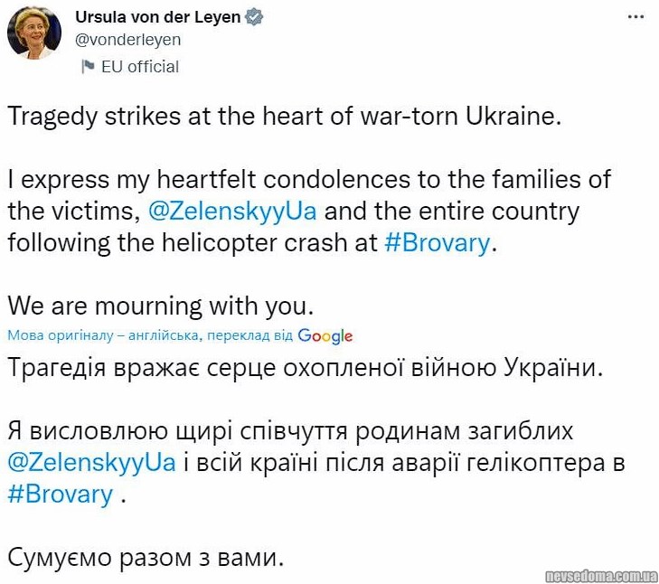 Лідери європейських країн висловлюють свої співчуття Україні через жахливу трагедію в Броварах.