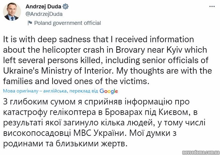 10:12 - Глава Нацполіції Ігор Клименко повідомив, що внаслідок авіакатастрофи загинуло керівництво МВС. Всього відомо про 16 загиблих, із них 2 дітей.