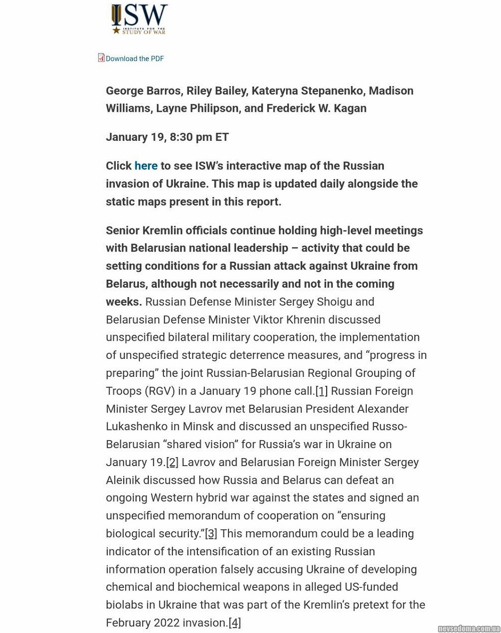 Нова російська атака з Білорусі протягом найближчих тижнів, на думку аналітиків Американського центру вивчення війни, є малоймовірною. Таку атаку вважають вірогіднішою наприкінці 2023 року, коли Росія та Білорусь планують провести масштабні навчання.