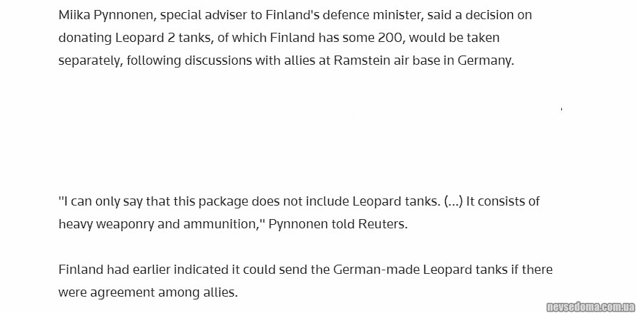 Рішення про можливе постачання танків буде прийнято окремо, зокрема, в рамках зустрічі міністрів оборони країн-партнерів України на базі Рамштайн, заявив (https://www.reuters.com/world/europe/finland-promises-400- million-euros-aid-ukraine-could-add-leopards-2023-01-20/) спеціальний радник голови оборони Фінляндії Міїка Піннонен.