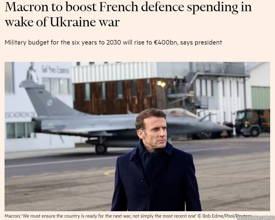Президент Еммануель Макрон пообіцяв (https://www.ft.com/content/36985cf0-715e-46f7-92cb-cce87d7cc8a6) збільшити витрати Франції на оборону до 2030 року, щоб пристосуватися до глобальних погроз і видобути уроки. росії в Україну.